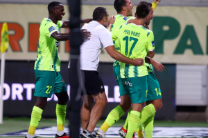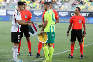 Στο πρώτο ημίχρονο ο ρυθμός της αναμέτρησης ήταν αρκετά καλός, με εναλλασσόμενη υπεροχή και την ΑΕΚ να έχει την πρώτη μεγάλη φάση στο 8ο λεπτό, όταν το δοκάρι σταμάτησε την κεφαλιά του Roberge. Στην επόμενη καλή ευκαιρία η ΑΕΚ ευτύχησε να προηγηθεί στο σκορ, όταν βρήκε γρήγορα στην επίθεση και ο Pons σκόραρε με σουτ μέσα από την μεγάλη περιοχή. Ωστόσο οι φιλοξενούμενοι απάντησαν άμεσα και στο 18ο λεπτό ισοφάρισαν με τον Nsame. Στα εναπόμειναντα λεπτά δεν άλλαξε κάτι με το 1-1 να είναι το σκορ του πρώτου μέρους.